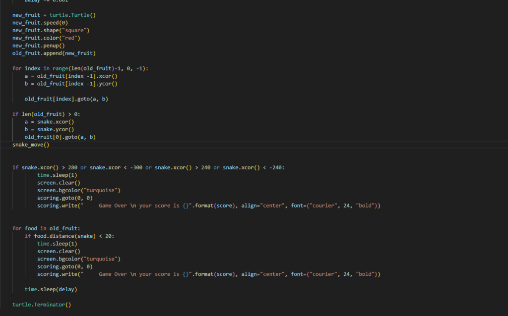 today i was working on the snake game and added new fruit functions and to have the fruit to appear and disappear when eaten its still not done yet but here are some screenshots of the code