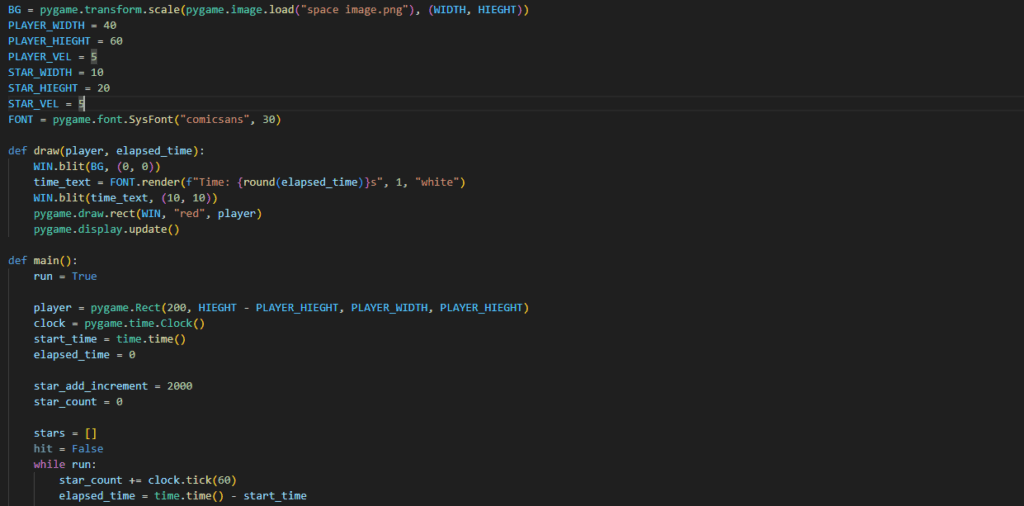 here is a screenshot and a piece of the code this code here makes sure the game is running and making the stars and the player