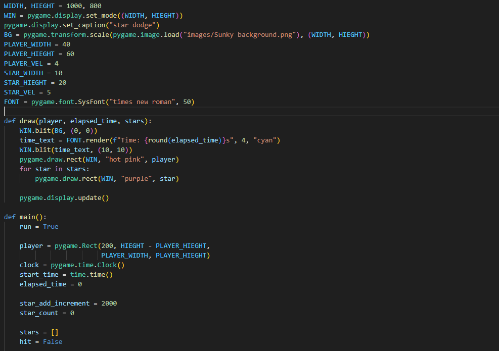 Today i worked on the dodging game and played around with some fun backgrounds and changed some of the code. here’s screenshots and some of the code and the video i used to help