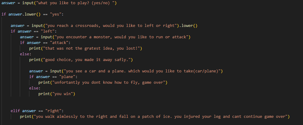 here is some of the code and it asking the user if they want to go left or right and if they go left they encounter a monster and are ask to run or attack it with one of them leading to a game over