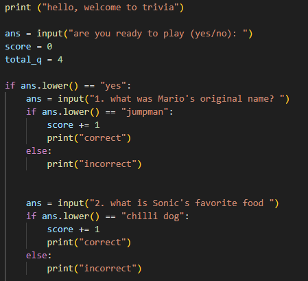 here’s some of the code and its asking the user if they wanna play and if they say yes they’re given the first question in this case “what was Mario’s original name?”