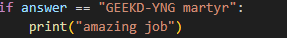 today i made a quiz game Posted on October 3, 2025 by brysyn ors this part of the code is one of the questions. and this part says that if your input is equal to the answer then it prints amazing job