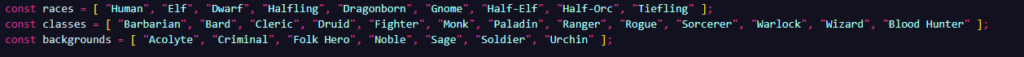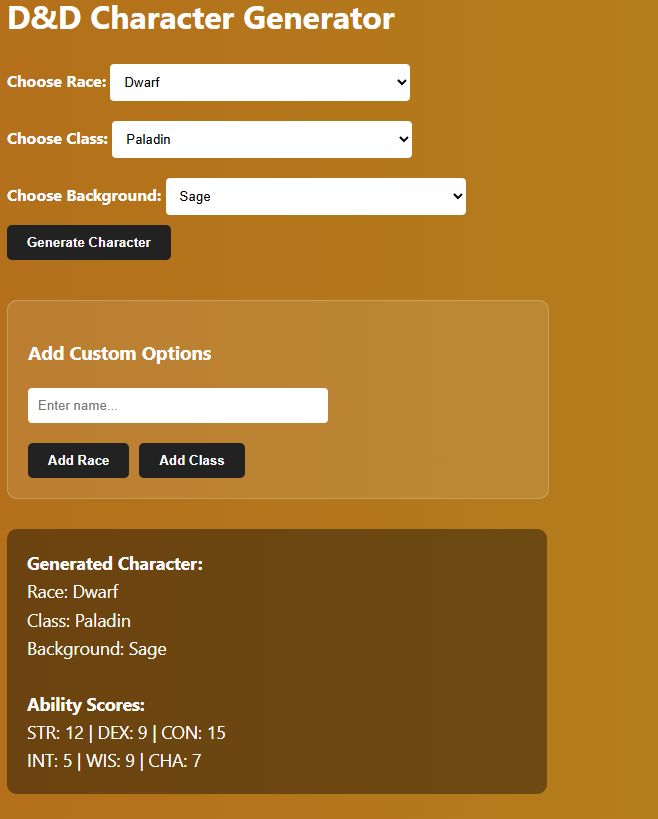 today i made a new dnd api thing. Posted on April 10, 2026 by brysyn ors this how it looks this is just the list of classes, races, and backrounds. this part im pretty sure rolls the stats. im happy with it i think its cool sooo yea thats what im working on.