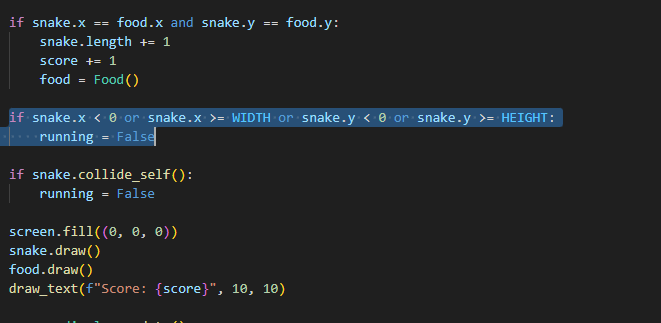 I used the code if snake.x < 0 or snake.x >= WIDTH or snake.y < 0 or snake.y >= HEIGHT: