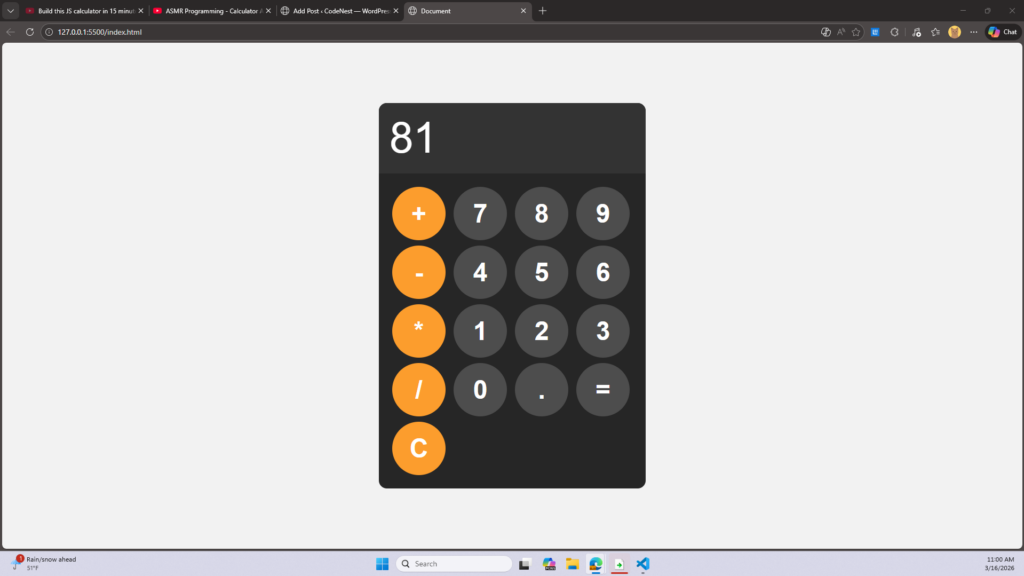 Today in class I made a calculator that does multiplication division subtraction and addidition with working buttons and numbers.