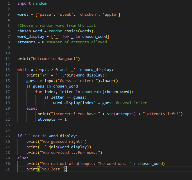 The program I worked on today was a simple game of Hangman. This game uses Python, and randomizes a list of words and chooses one to let the user guess. The user is limited to eight attempts. If the user gets a letter wrong, the program will display “Incorrect!” plus the number of attempts remaining.