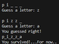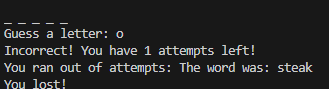 If the user gets a letter right, the game will continue and no attempts are lost. Once the user runs out of attempts, the game will end. If the user guesses the word correctly, they will be congratulated. This program taught me how to uncapitalize words entered in an input.
