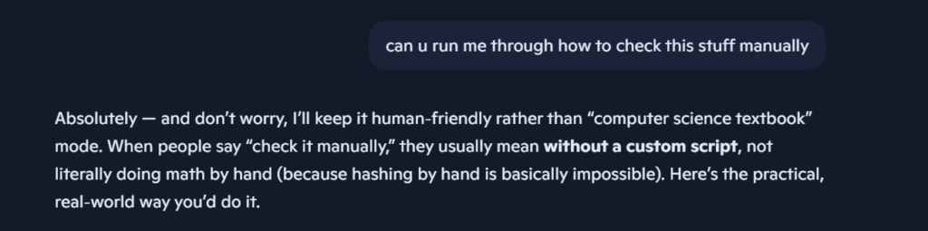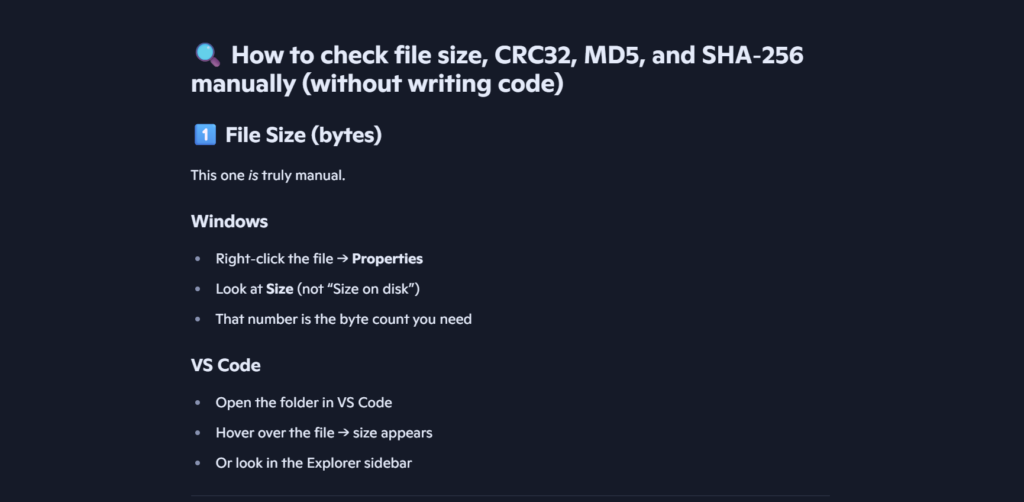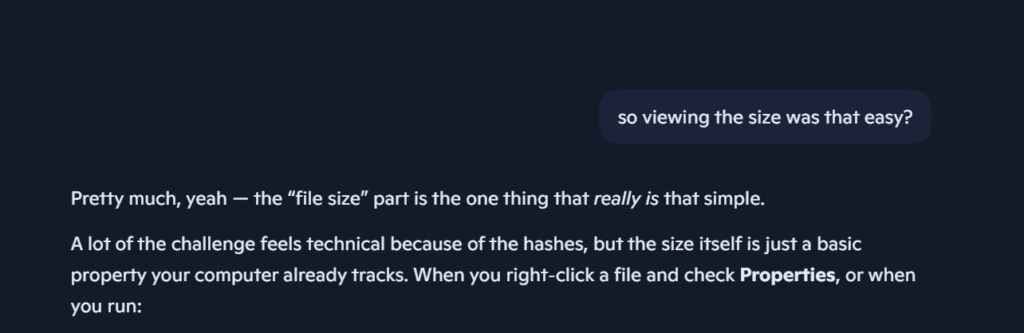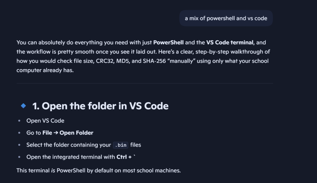 Today, for Free Friday, I worked on trying to find the metadata like file size, and cryptographic hashes of a .BIN file manually for Cyberpatriot. I asked an AI(Copilot), for some needed assistance. I found that viewing the size, type, and permissions of a file could be done in vscode, powershell, and the file explorer.