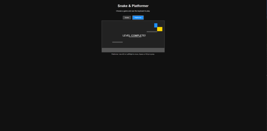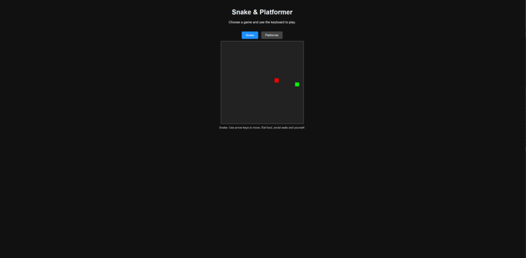 Today I worked on a browser based mini game project using HTML, CSS, and JavaScript. Instead of just one game, I built two. One is a classic Snake game, and one is a simple platformer. The page lets you switch between them with buttons.