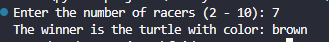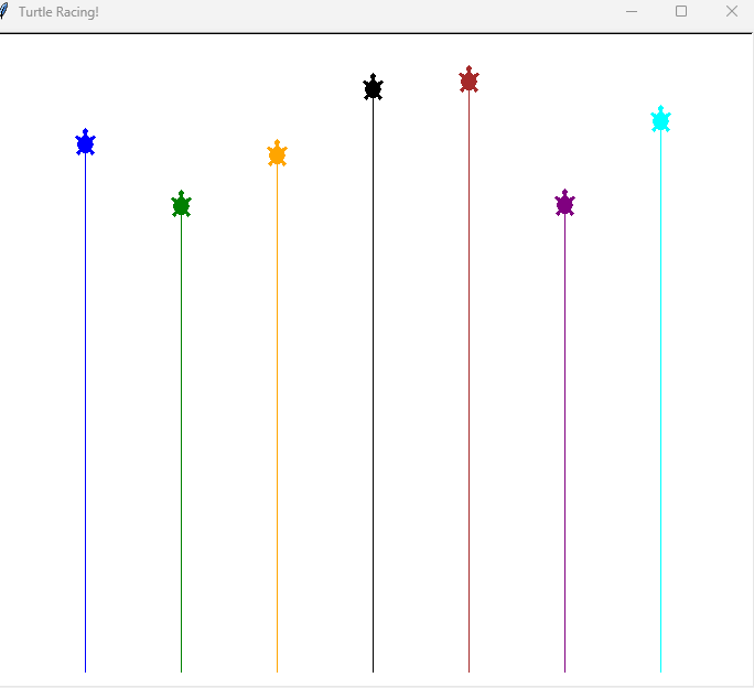 ^This function runs the actual race. It loops forever, moving each turtle forward by a random distance between 1 and 20. After each move, it checks whether a turtle has reached the top of the screen. As soon as one crosses the finish line, the function returns the color of the winning turtle.