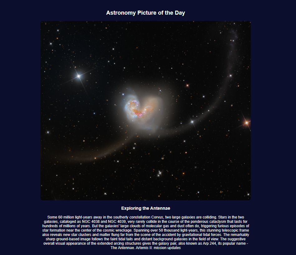 ^This hits the NASA API, retrieves the daily data, and selects the correct HTML elements to inject the content into. I also ensured the apodTitle and apodDesc update every time so the user can read the context behind the visuals.