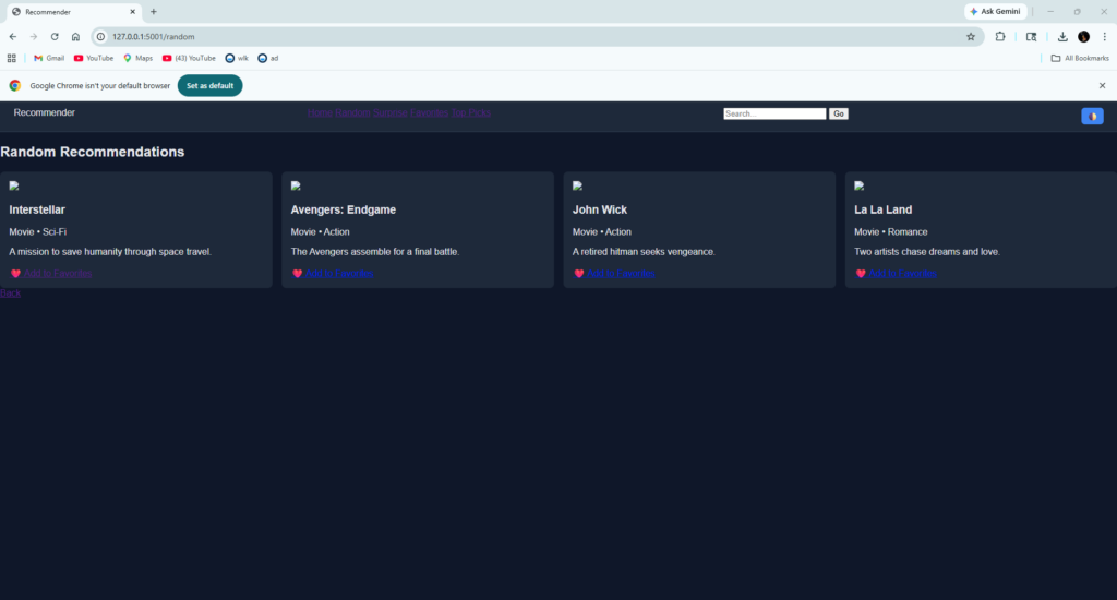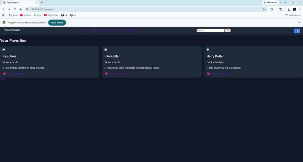 Today I built a fully interactive Movie and Book Recommendation App. I’m working on a clean interface that makes the whole project look professional, I have included features like AI‑style recommendations, a search bar, random picks, and a “Surprise Me” button. Along the way, I created a favorites system and even added dark/light mode.so far i like the progress and can see it being a modern, dynamic recommendation platform that I’m genuinely proud of.