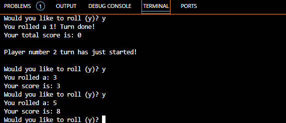 Today I did a mini project of making a roll dice game in Virtual Studio Code. I learned about multiple rules that goes into making the game. With functions and codes such a minimum, maximum, and a bunch of while loops, ifs, and else. These are crucial for making the game work. What I made today is basically a roll dice game where there’s two to four players and each of them have a chance to roll a number between 1-6 to and each round, they add the number they get but if the player gets a number 1 their points get reset. The player with the most points wins the game.