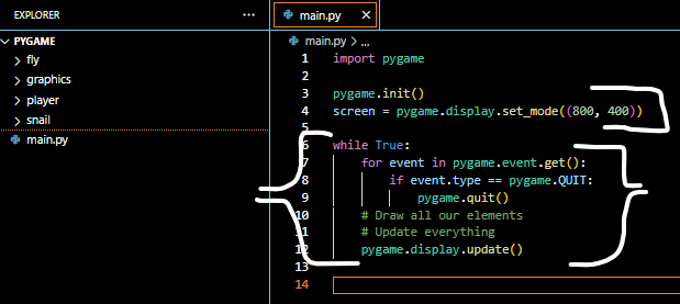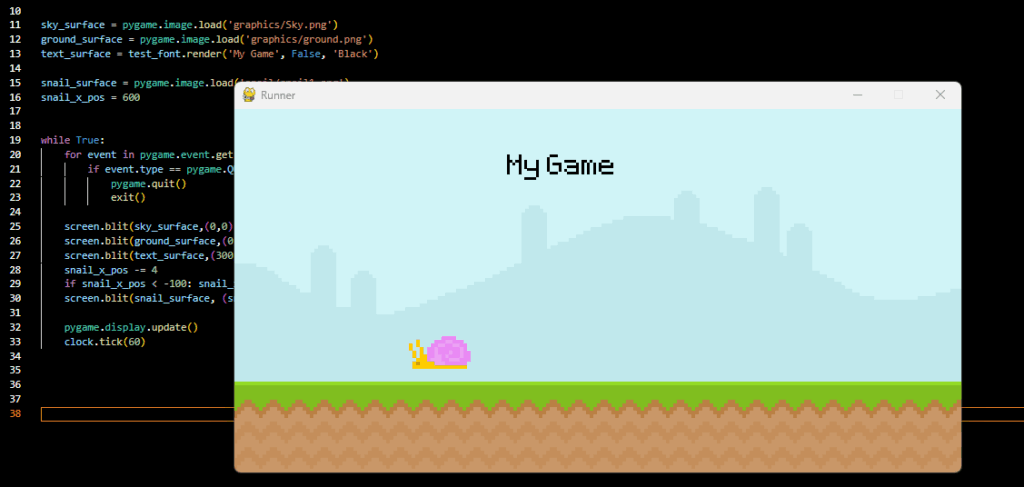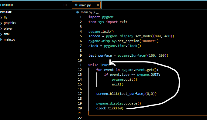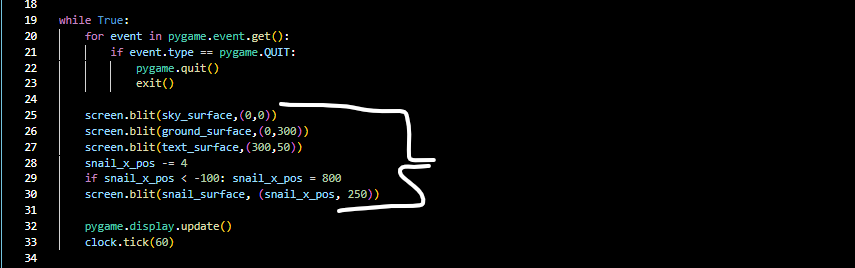 The clock.tick tells the while loop to run for 60 Times per second and that it shouldn’t be any faster or slower, this makes sure the game doesn’t run too fast