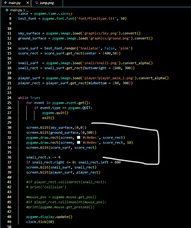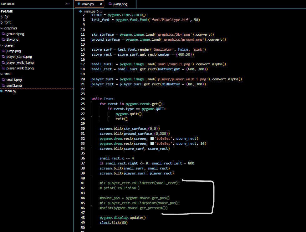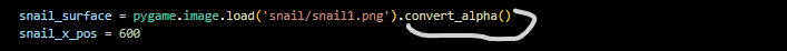 The highlighted code are responsible for the collisions between the player and the snail and when they collide it outputs 0 and when they collide it outputs 1 which is helpful for if statements.
