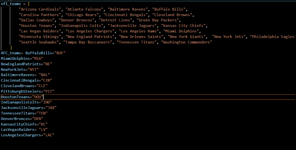 this tells the code the teams names and theyre abbreviations so im hoping it ends the code getting it confused with a diffent team