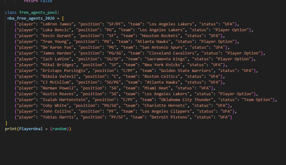 the conracts will all be random for example james harden lets say he signed with the bulls for 5 years for oh i dont know 24.6 millon then the code would print james harden has signed a 5 year $24.6 millon deal with Chicago Bulls